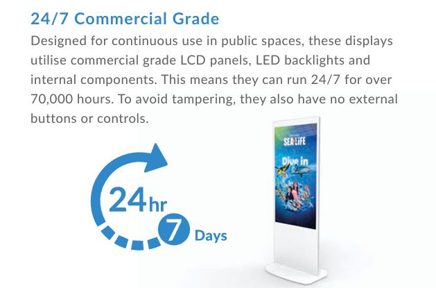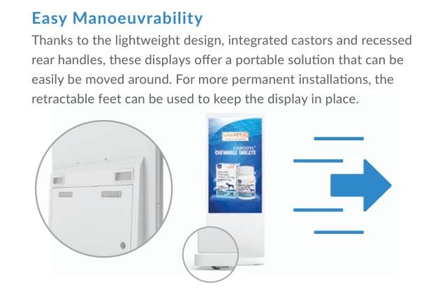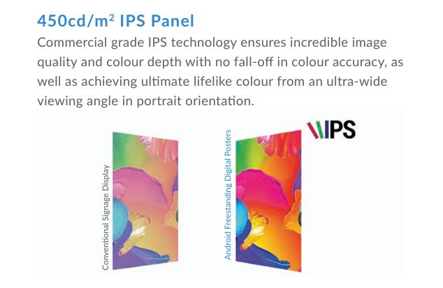 • 450Nit Brightness • 180 degree angle Viewable • Built-in All-in-One media player • Built-in Locking Casters • Locking Security Panel • Space in front for Custom Logo • Wifi or Network connection • BrightShow Embedded Media Management